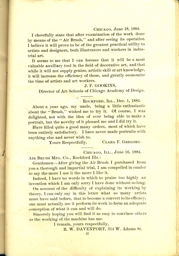 | 1884 Liberty Walkup Air Brush Mfg. Co. Booklet Page 27 | ||