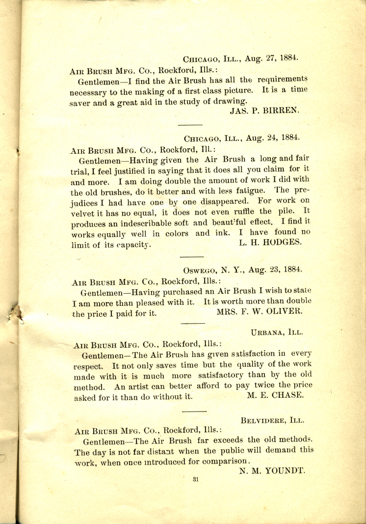 | 1884 Liberty Walkup Air Brush Mfg. Co. Booklet Page 31 | ||