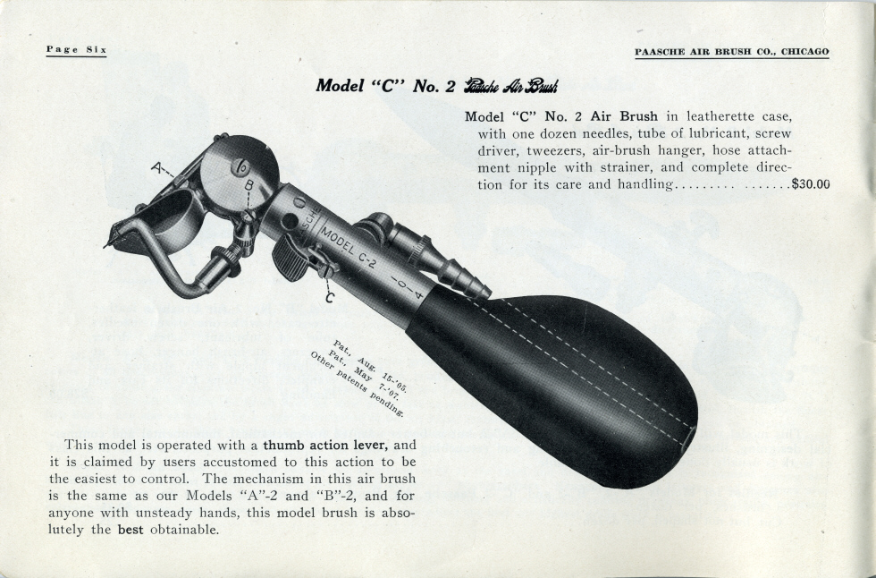 Page 6 of the 1915 Paasche Art Catalog. The Paasche Model C with it's unique handle designed to let the user operate the trigger with his/her thumb. A holdover from the Walkup. The cup is rigidly mounted and is not adjustable. The cup and the air blast tube are interchangeable with the cup and the air blast tube from the Models A and B. |