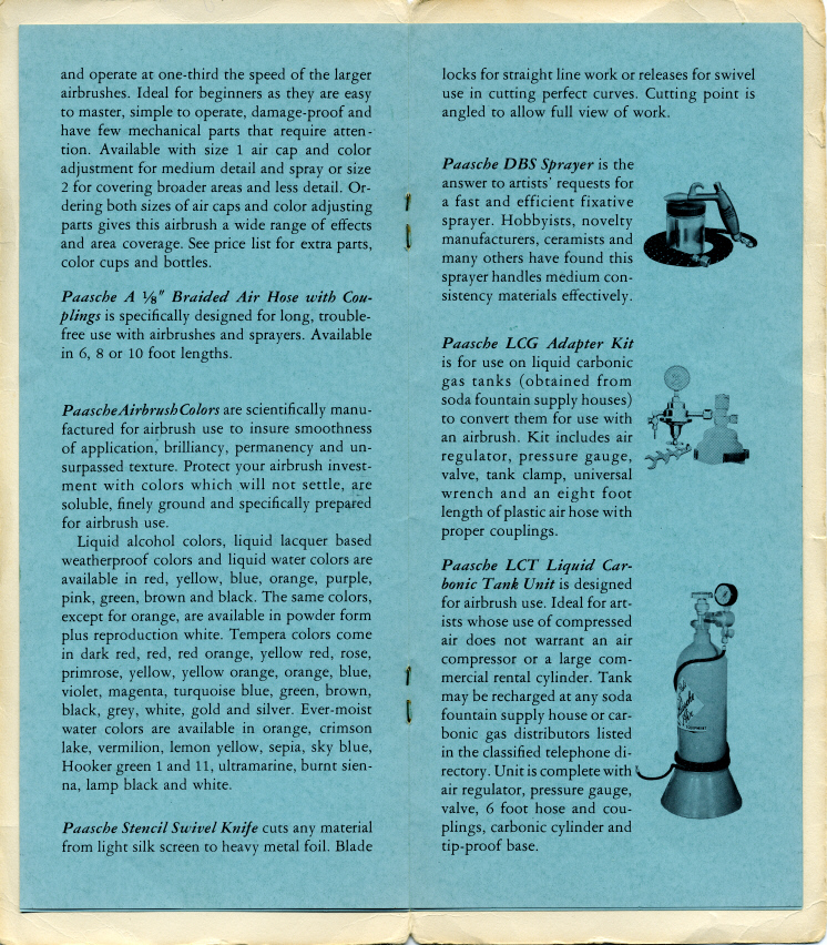 1947 Paasche Airbrush flyer showing the line of products for the artist. This evolved into the one-sheet multiple fold flyers of today. |