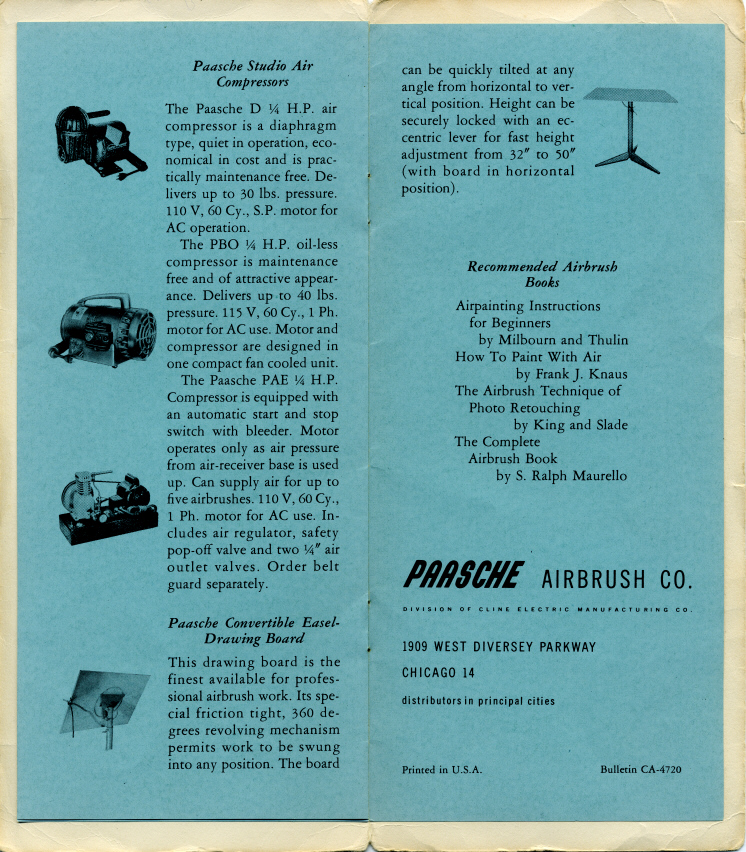 1947 Paasche Airbrush flyer showing the line of products for the artist. This evolved into the one-sheet multiple fold flyers of today. |