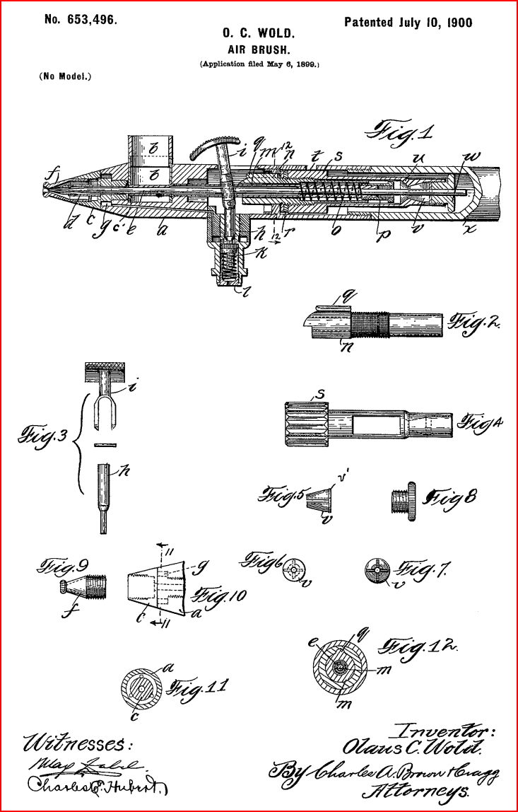 Wold's 1900 airbrush design uses removable rings that stack on top of each other to make the paint cup taller and able to hold more paint. It also introduces the "stirrup" design for the trigger lever. | ||