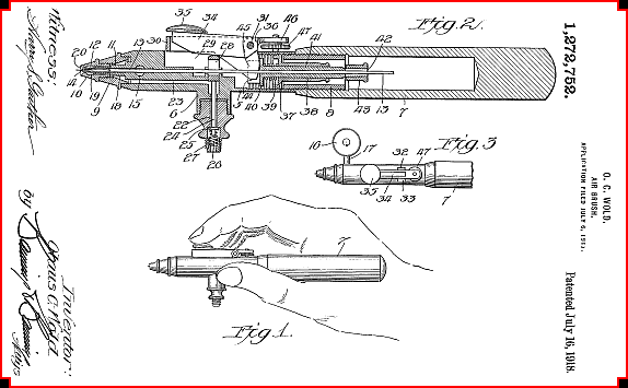 In 1917 Olaus Wold patented this double action airbrush that uses a trigger that travels up and down to control both the air and the paint. When the trigger is depressed you first get air and then paint. The farther you depress, the more paint you get. It's a nifty idea but in practice you don't have the control of the "traditional" double action airbrush. | ||