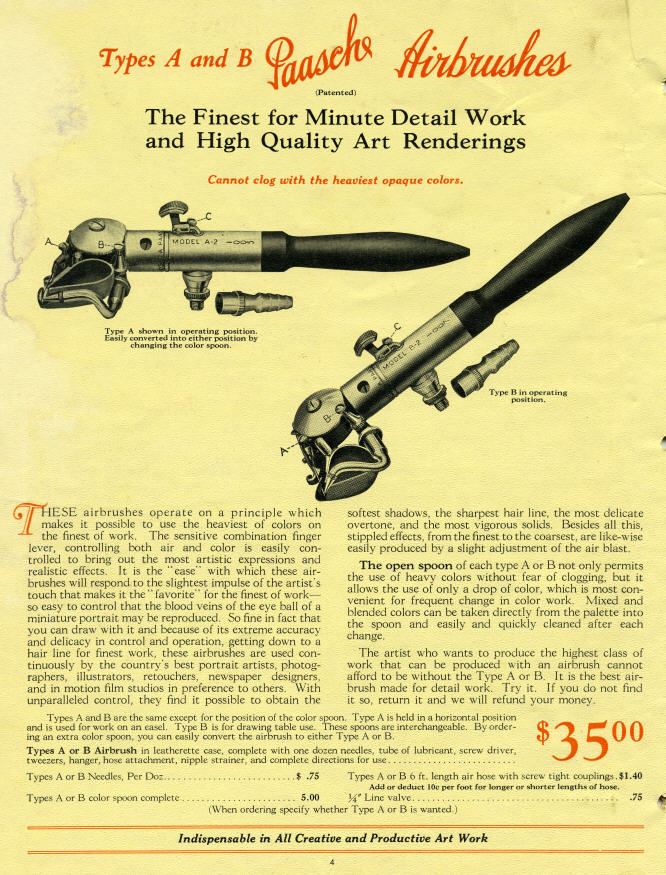 The 1926 Paasche Catalog page for the 20's versions of the "turbo." The Paasche A was designed to be used on an upright easel while the the "B" was used for horizontal work. They are the same, the only difference is the spoon/color cup and the air blast tube. |