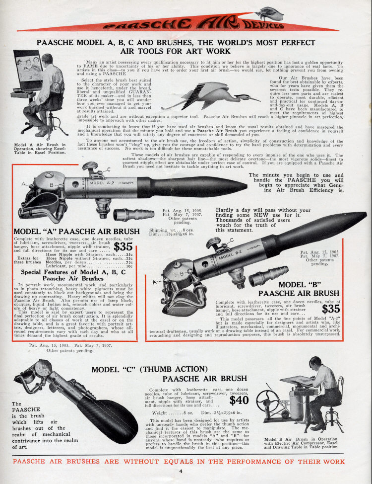 Paasche Airbrush catalog #18 from 1923. This page features the "Models A, B, & C," early versions of the current "AB." The difference between the "Model A" and "Model B" is the angle of "spoon" (paint cup) and the air blast tube. The "A" was for use on an easel while the "B" is for horizontal work. The "Model C" is the oddest and rarest of the Paasche "Turbos." It was designed with a thumb actuated trigger. To see more about the "Model C," and the two in the collection, click here. (Opens in new window!) |