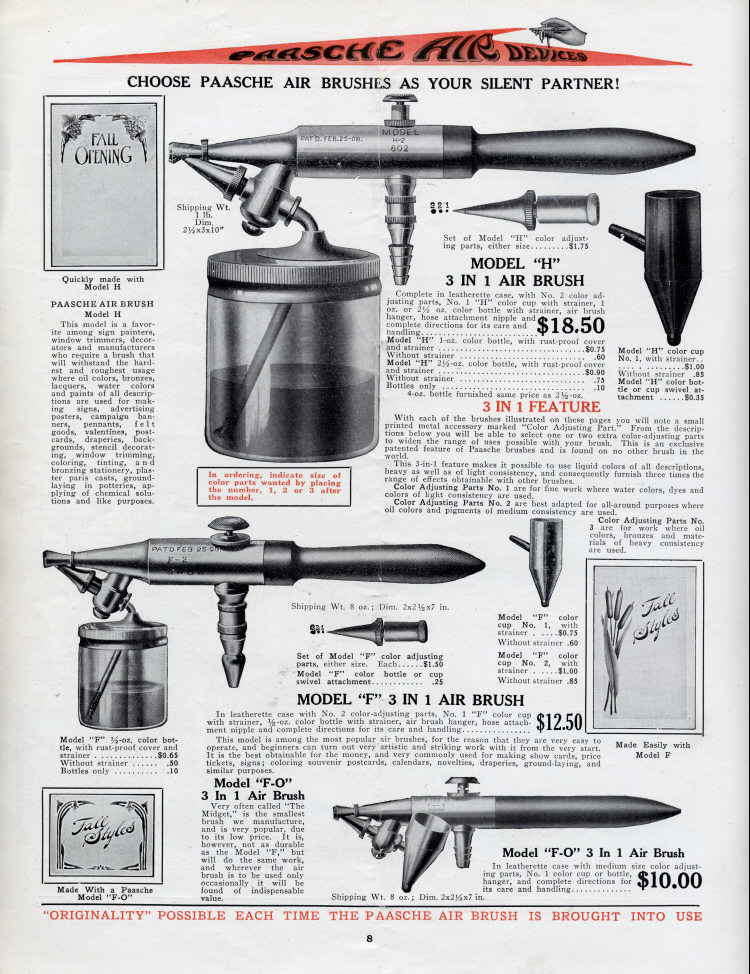 This page from the 1923 Paasche Airbrush catalog #18 features the "Models H, F, & FO." The "H" & "F" are still made today. The only difference are cosmetic changes and changes in the trigger assembly. The "FO" was just an economy version of the "F." |