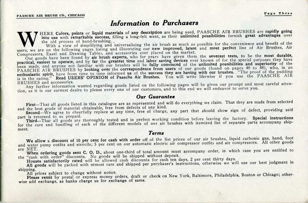 Page 3 of the 1915 Paasche Art Catalog. The fine print, so to speak. |