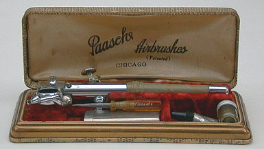 Left: An early Paasche Model C. It is a thumb operated version of the Model A & B. The handle design is based on a 1907 Paasche patent claiming "a handle conforming better to the hand than the cylindrical handle heretofore used". It was also suggested for for those with "unsteady hands." The air hose passes through the handle to right angle fitting on the air valve body. The trigger is thumb actuated as in the original Walkup design. It is the rarest of the "Turbo" variants. It is marked "J.A. Paasche" rather than "Paasche Airbrush Co." It is shown in the 1923 Paasche catalog #18. (Click here to visit that page-opens in a new window) |