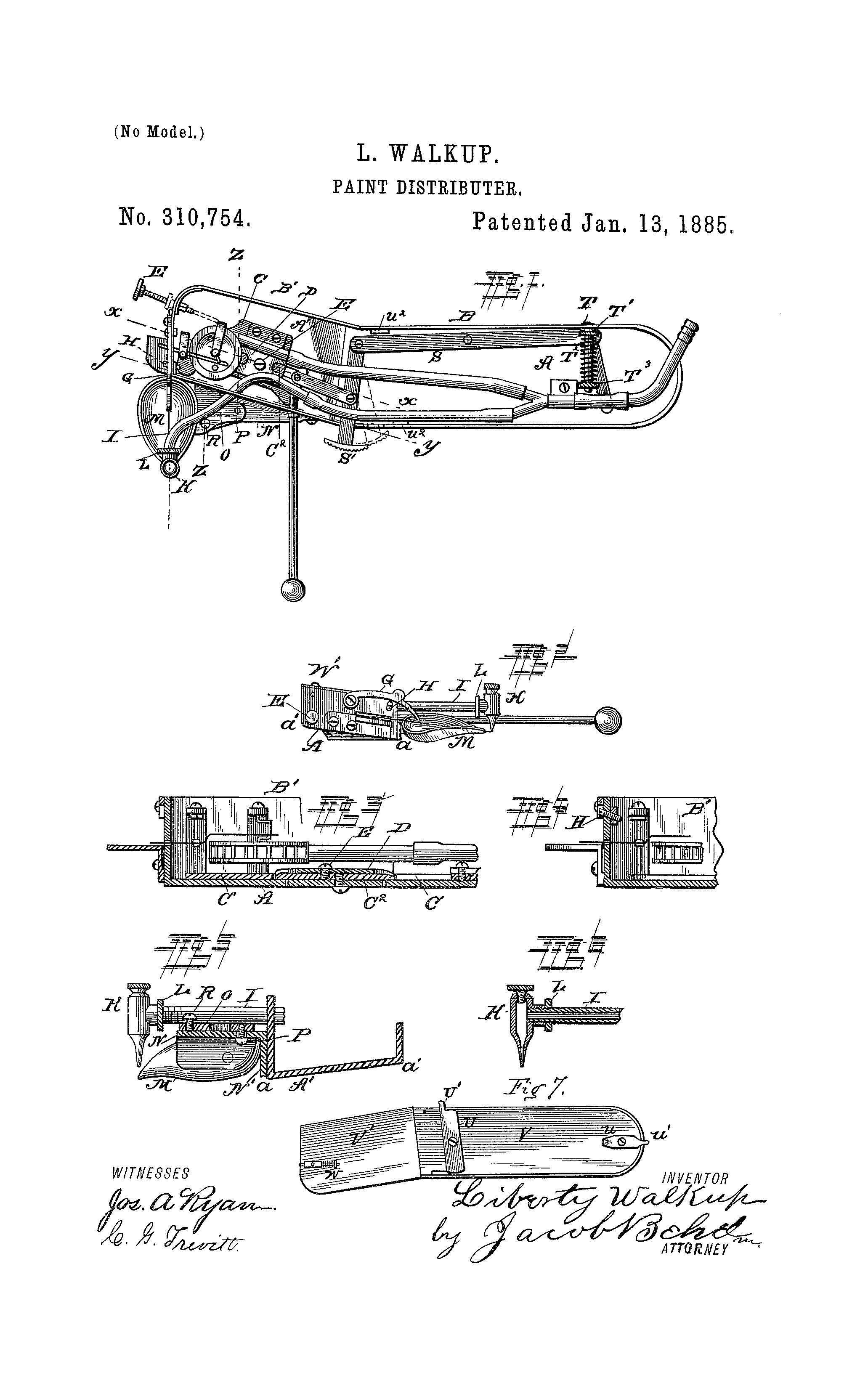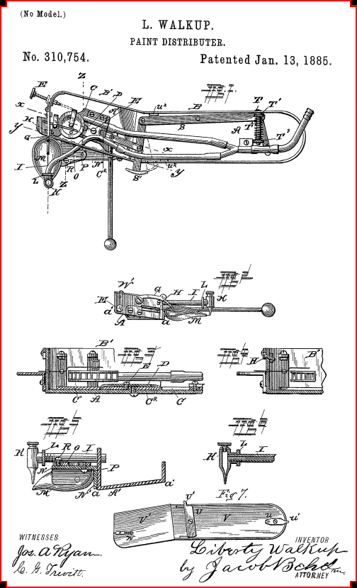 The fourth Airbrush! In January, 1885, Walkup is granted a patent for an upgraded airbrush with two main improvements. First, the mechanism that pinches the rubber tubing to regulate the air flow at the rear is simplified and moved inside body. Second, the air blast tube can now be adjusted so as to maintain proper alignment with the needle. |