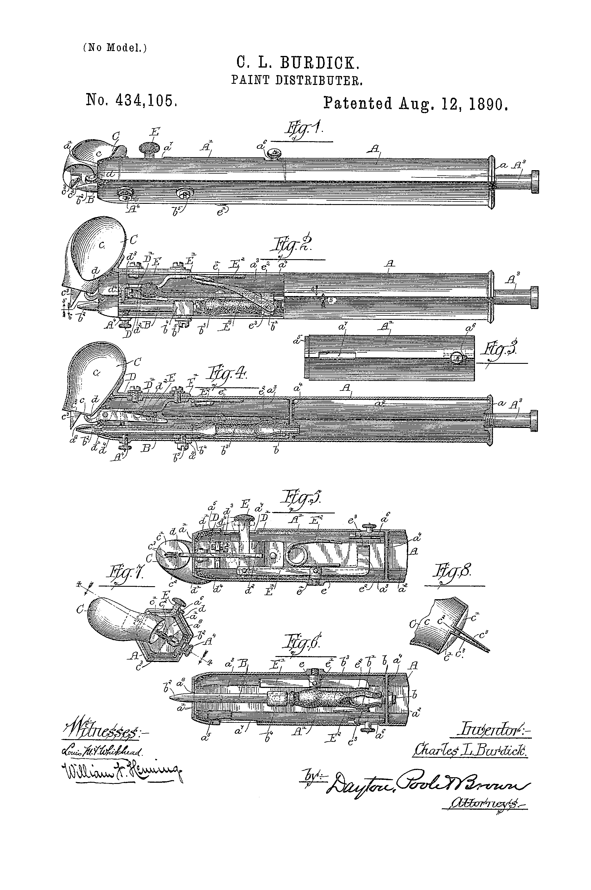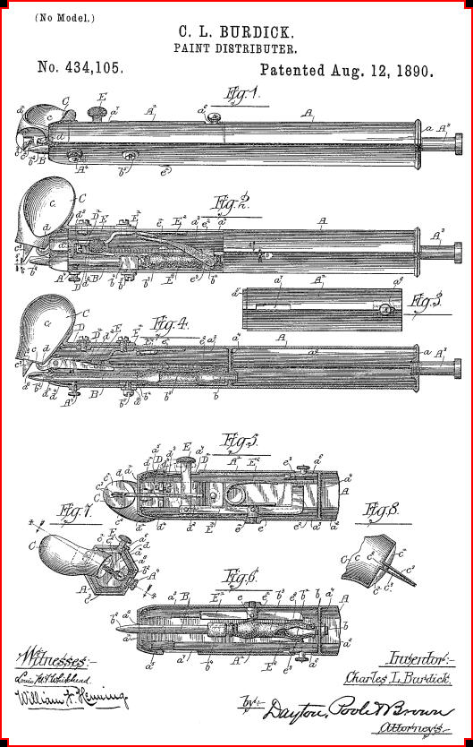 Charles Burdick's filed for this patent (his first?) on November 15, 1889 for a"paint distributer" and it was issued August 12, 1890. This patent is for an external mix airbrush that uses two small triangular metal pieces attached to the paint cup(Fig. 8) to form a nib similar to ruling pen. These hold the paint in front of a nozzle and when the trigger is pressed, the paint is "carried forward in a fine spray." The trigger ca be pushed forward or back to vary the the space in the nib thereby controlling the width of the spray. | ||