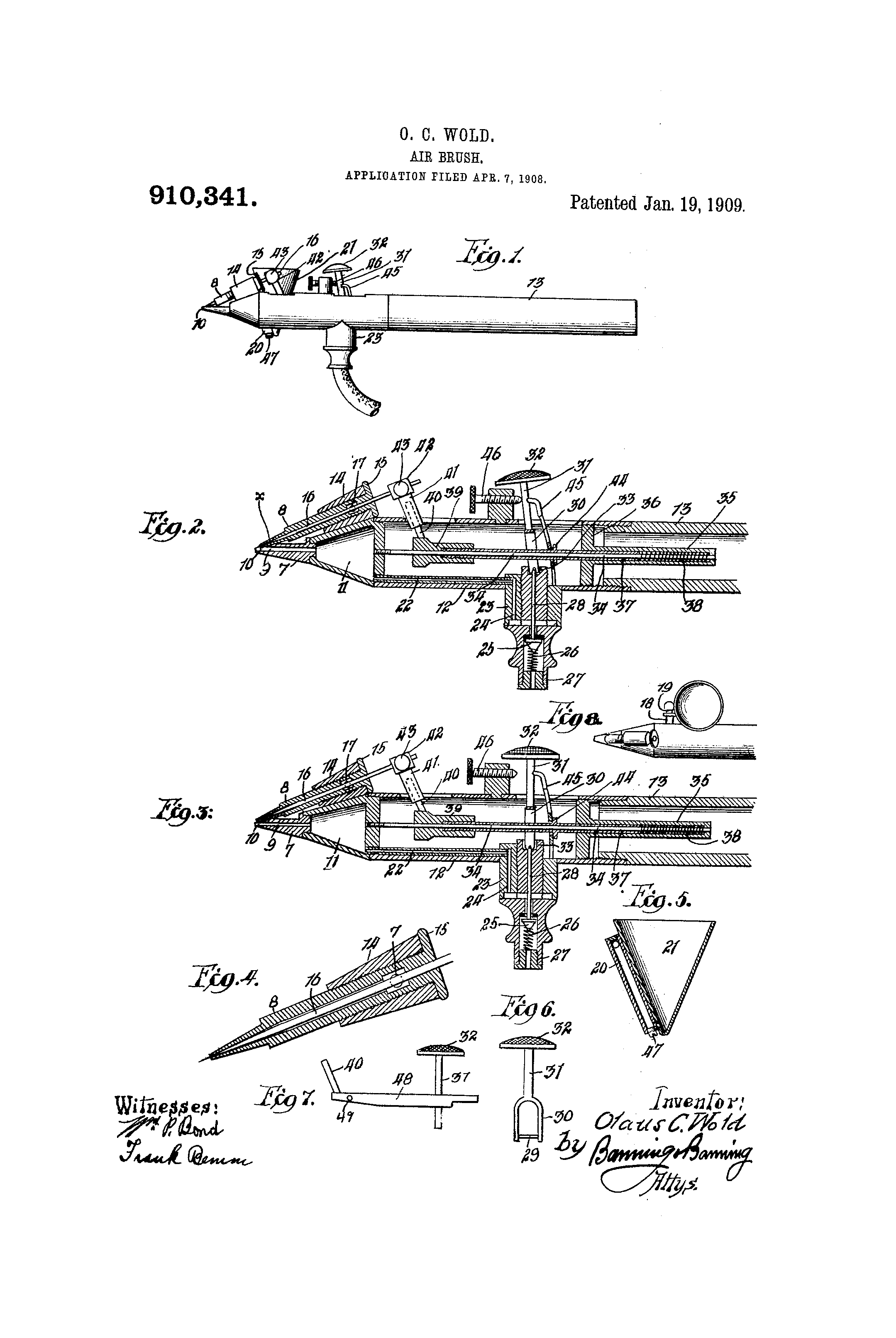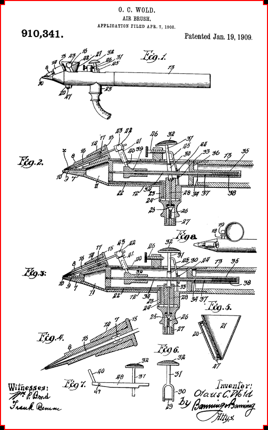 Olaus Wold's 1909 patent is for a double action, external mix airbrush that uses a linkage to move the needle in the ink nozzle housing (#8) that sits atop the front of the airbrush body. The paint cup then fits into an opening in the ink nozzle housing, Fig. 4, #7. The basic idea of this airbrush was to stop the paint from clogging the air nozzle and to keep the paint or ink from leaking into the body of the airbrush. There are two errors in the drawing that confuse how the airbrush operates. One is the misnumbering in Fig 4 where the opening #7 should be marked as #17. The second is in the top view "Fig a" where the paint cup is incorrectly shown attached to the body instead of the ink nozzle, #8. | ||