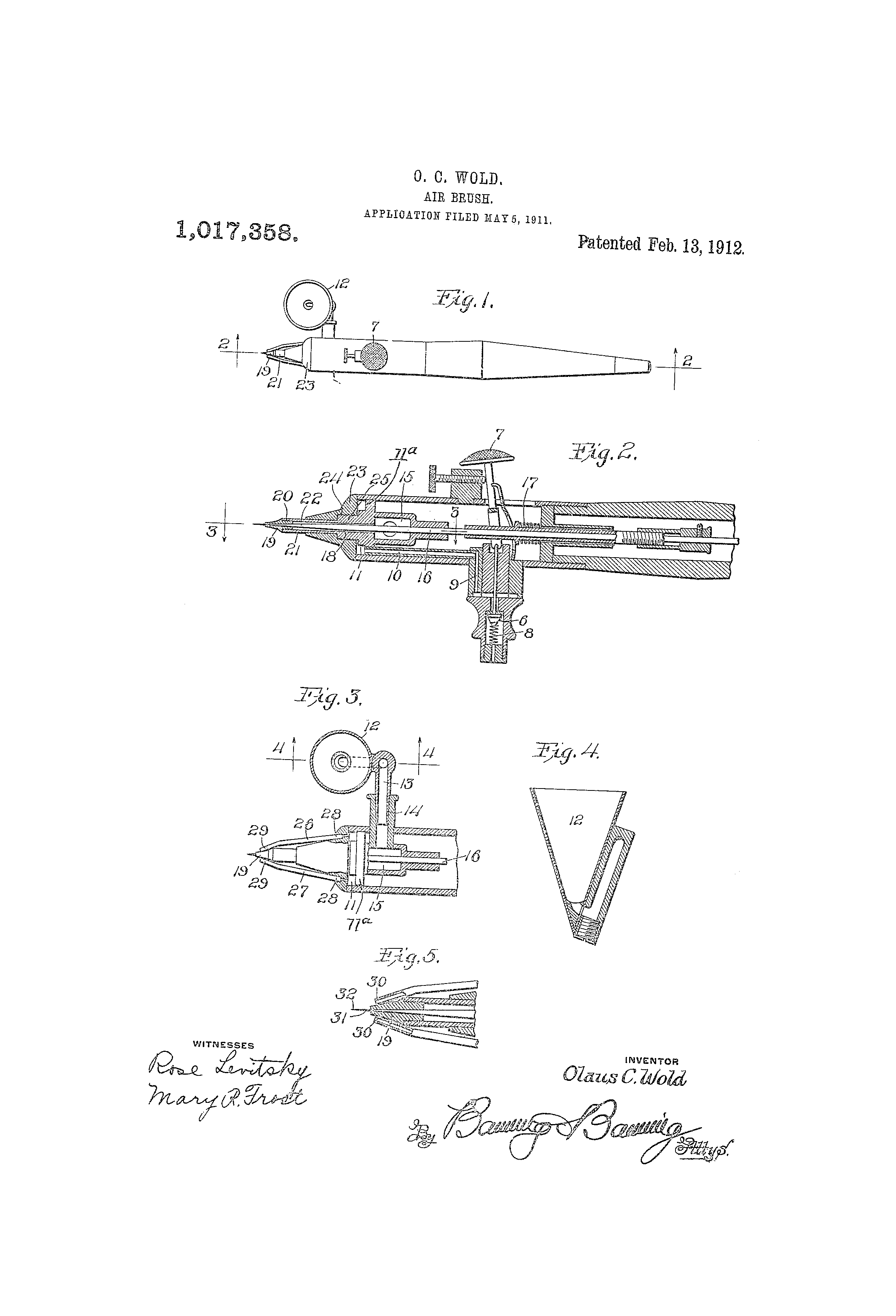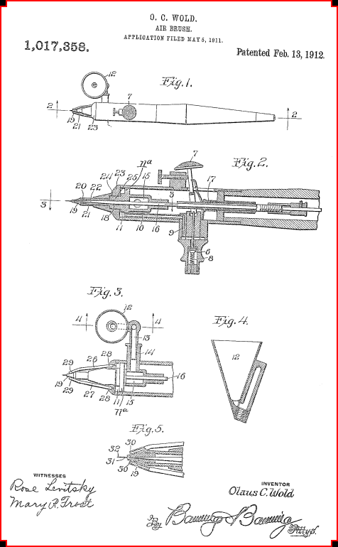 Wold's 1912 airbrush patent used two small auxillary air tubes that project out from the front of the body to blow air on either side of the tip, creating a flat fan shaped pattern. Large spray guns still use the same idea. | ||